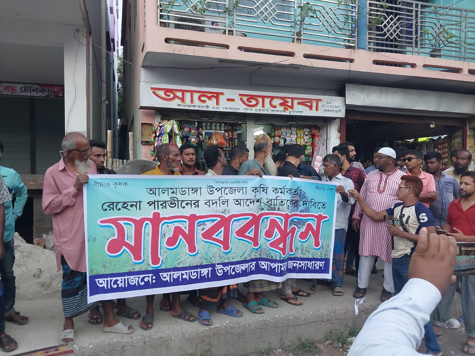 আলমডাঙ্গা অফিসঃ আলমডাঙ্গায় প্রথমবারের মতো একজন কৃষি কর্মকর্তার বদলির প্রতিবাদে রাস্তায় নেমেছেন সাধারণ কৃষকরা।গত বৃহস্পতিবার (২১আগস্ট ২০২৫) কৃষি সম্প্রসারণ অধিদপ্তর থেকে জারি করা প্রজ্ঞাপন আদেশে কৃষি অফিসার রেহেনা পারভীনকে হঠাৎ বদলি করা হয়।বদলির আদেশকে ‘অযৌক্তিক’ ও ‘ষড়যন্ত্রমূলক’ আখ্যা দিয়ে গতকাল বুধবার আলমডাঙ্গা হাইরোড আল তায়েবার মোড়ে মানববন্ধন করেন। মানবন্ধন শেষে উপজেলা নির্বাহী অফিসার বরাবর একটি স্মারকলিপি প্রদান করেন।