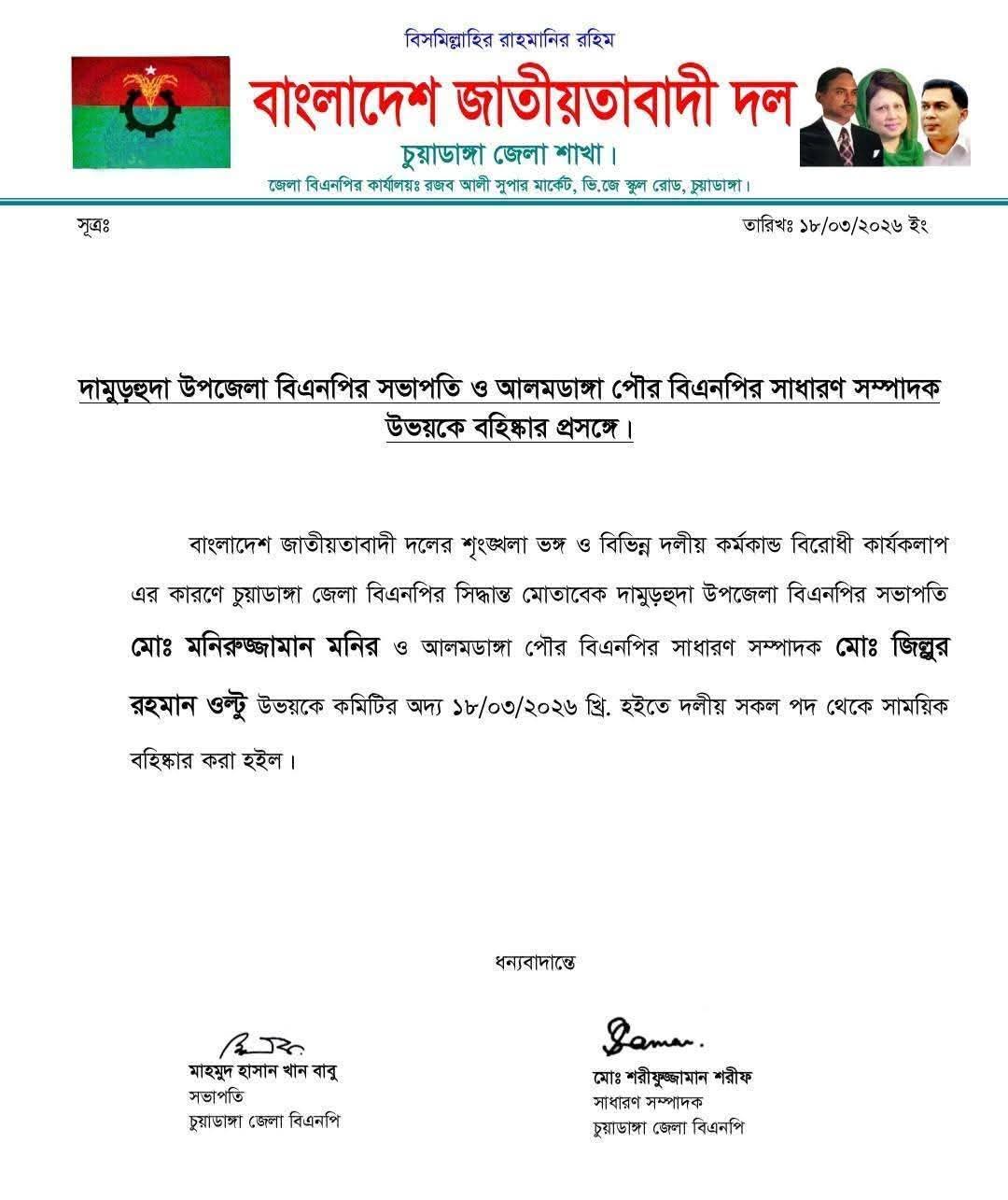 দলীয় শৃঙ্খলাভঙ্গ ও বিরোধী কর্মকাণ্ডে জড়িয়ে পড়ায় চুয়াডাঙ্গার দামুড়হুদা উপজেলা বিএনপির সভাপতি মনিরুজ্জামান মনির ও আলমডাঙ্গা পৌর বিএনপির সাধারণ সম্পাদক জিল্লুর রহমানকে দল থেকে বহিষ্কার করা হয়।