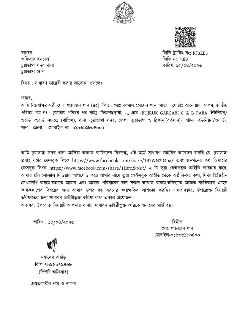 সোশ্যাল মিডিয়া প্ল্যাটফর্ম ফেসবুকে ভুয়া পেইজ খুলে সামাজিক যোগাযোগমাধ্যম চুয়াডাঙ্গা প্রবাহ নামে একটি ফেসবুক পেজ থেকে ছাত্রনেতার বিরুদ্ধে অসত্য ও অপপ্রচার ছড়ানোর অভিযোগ এনে সাইবার নিরাপত্তা আইনে সাধারণ ডায়েরি (জিডি) করেছেন চুয়াডাঙ্গা জেলা ছাত্রদল সভাপতি শাজাহান খান।