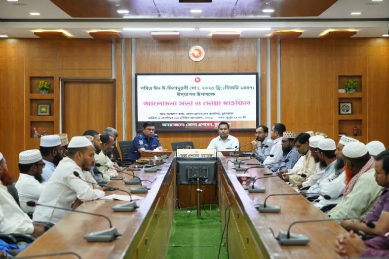 চুয়াডাঙ্গায় পবিত্র ঈদে মিলাদুন্নবী (সা:) উদযাপন উপলক্ষে আলোচনা সভা ও দোয়া অনুষ্ঠিত হয়েছে। আজ শনিবার দুপুরে জেলা প্রশাসকের কার্যালয়ের
