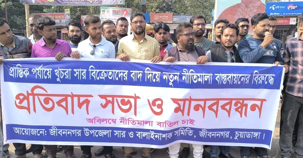 জীবননগর সার ডিলার নিয়োগ নীতিমালা বাতিল চেয়ে জীবননগরে খুচরা সার ব্যবসায়ীদের মানববন্ধন