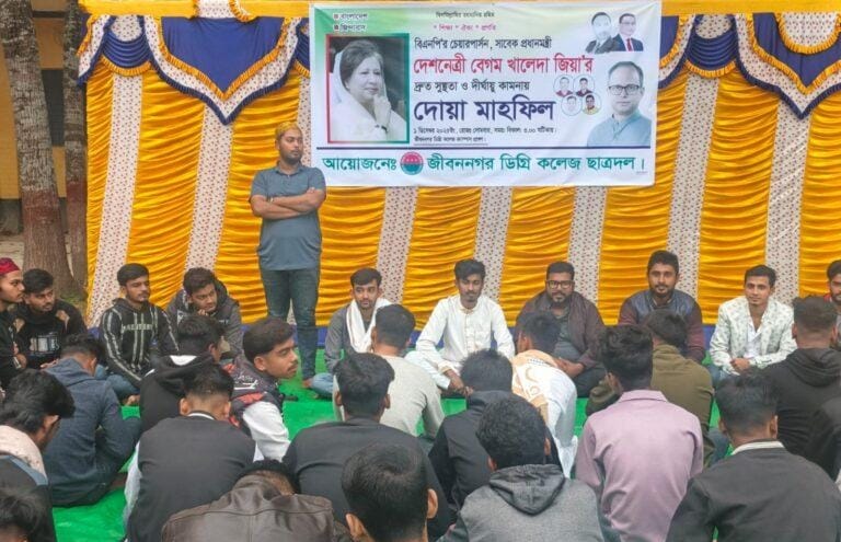 বিএনপি চেয়ারপার্সন ও সাবেক প্রধানমন্ত্রী বেগম খালেদা জিয়ার রোগমুক্তি ও সুস্থতা কামনায় জীবননগরে ছাত্রদল ও শ্রমিকদের আয়োজনে দোয়া মাহফিল