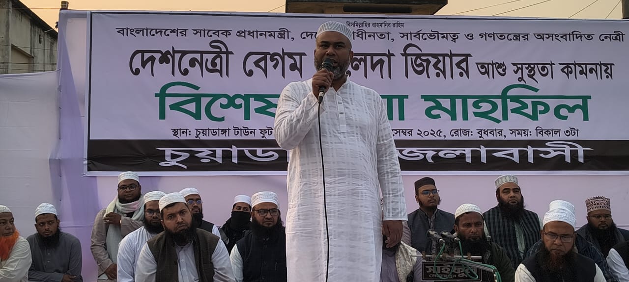 বিএনপি চেয়ারপার্সন ও সাবেক প্রধানমন্ত্রী দেশনেত্রী বেগম খালেদা জিয়ার সুস্থতা কামনায় চুয়াডাঙ্গায় বিশেষ দোয়া মাহফিল অনুষ্ঠিত হয়েছে। চুয়াডাঙ্গা জেলাবাসীর