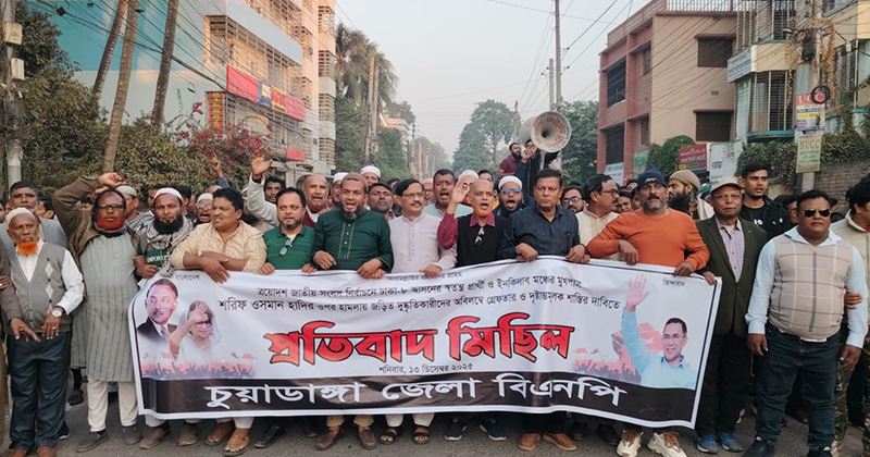 ঢাকা-৮ আসনের স্বতন্ত্র প্রার্থী এবং ইনকিলাব মঞ্চের মুখপাত্র শরিফ ওসমান হাদির ওপর হামলার প্রতিবাদে চুয়াডাঙ্গা জেলা বিএনপি এবং এর